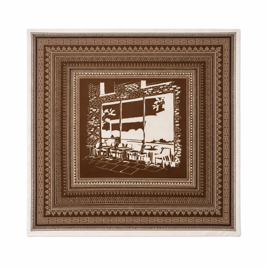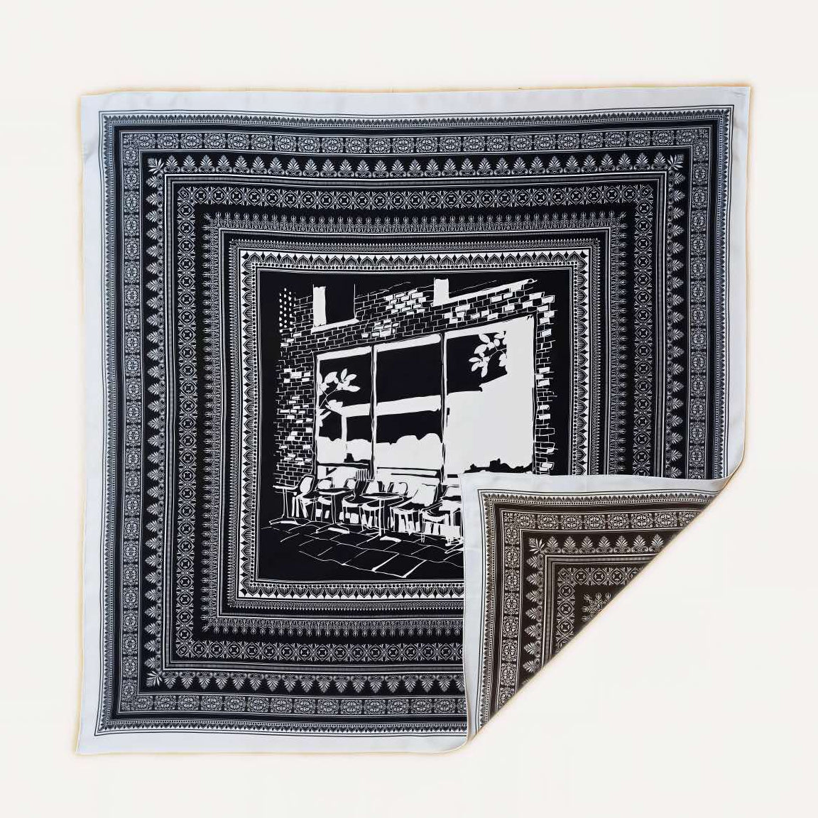 100% Silk Twill Hand-Made Scarf – Black & White Cafe Sketch 90x90cm