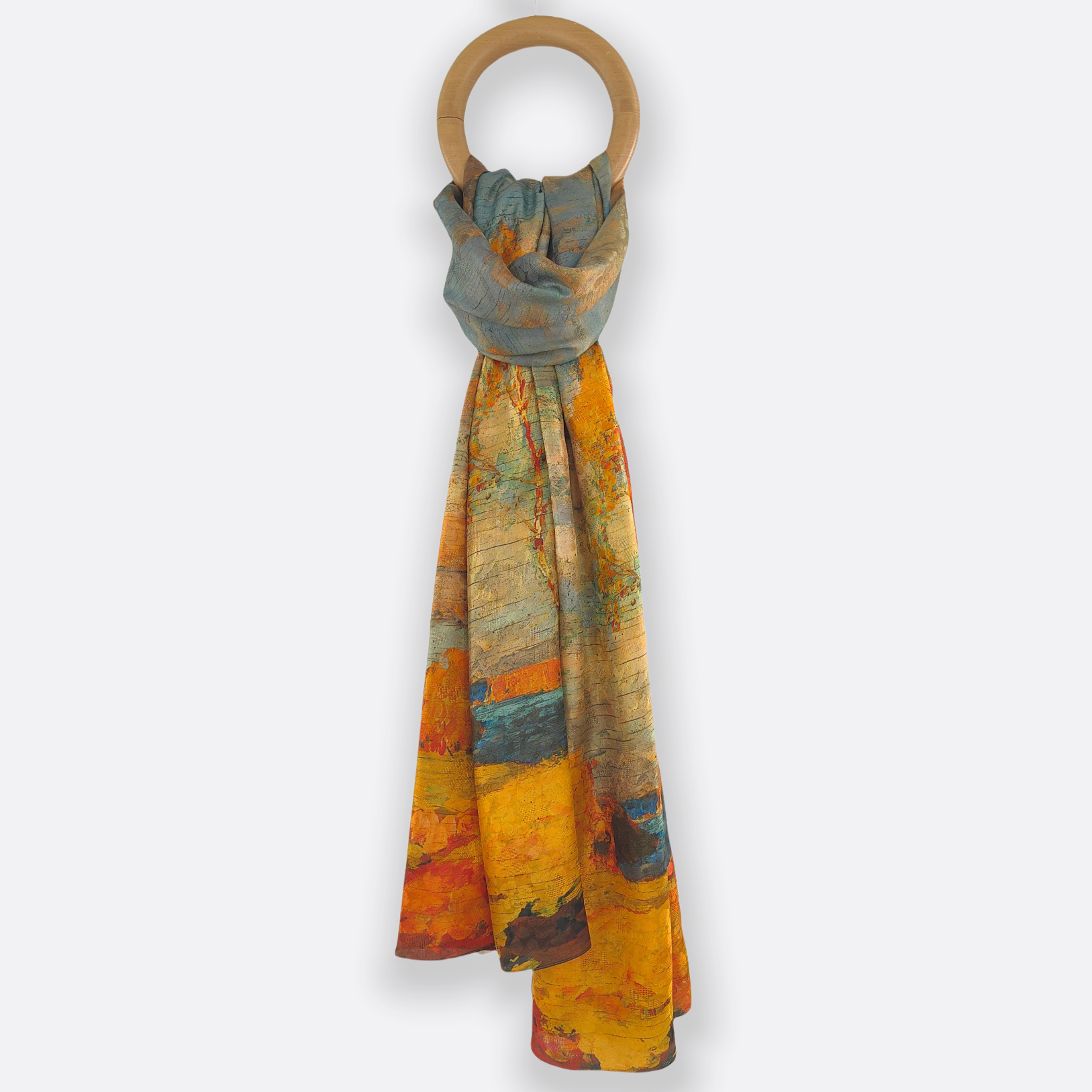 This exquisite silk scarf draws inspiration from the warm, vibrant hues of autumn, with a design reminiscent of an oil painting. The rich shades of amber, rust, and gold blend seamlessly, capturing the essence of fall’s beauty in a sophisticated, artistic pattern. The luxurious silk fabric drapes effortlessly, offering both warmth and elegance, making it the perfect accessory for the autumn season. Whether worn as a statement piece or as an elegant addition to your outfit, this scarf adds a touch of refined artistry to any look.