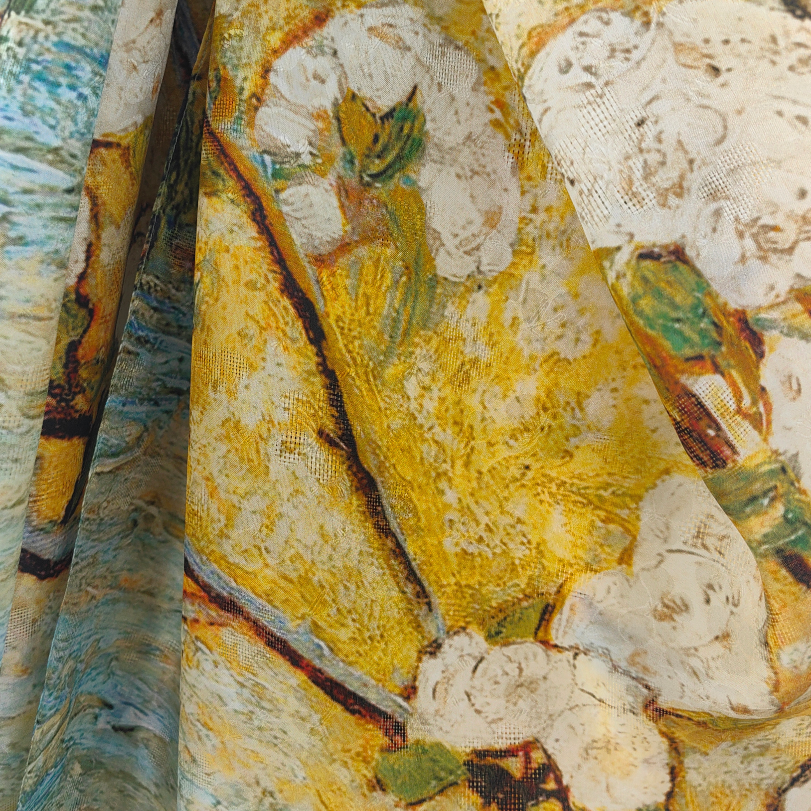 This stunning silk scarf captures the warmth of golden earth tones, beautifully complemented by soft white floral motifs reminiscent of an oil painting. The rich, warm hues of gold and amber evoke the peaceful serenity of nature, while the delicate white flowers add a timeless, artistic touch. Crafted from luxurious silk, it drapes gracefully, offering both elegance and comfort. Perfect for adding a refined yet artistic flair to any outfit, this scarf brings a sophisticated blend of color and design to your wardrobe.