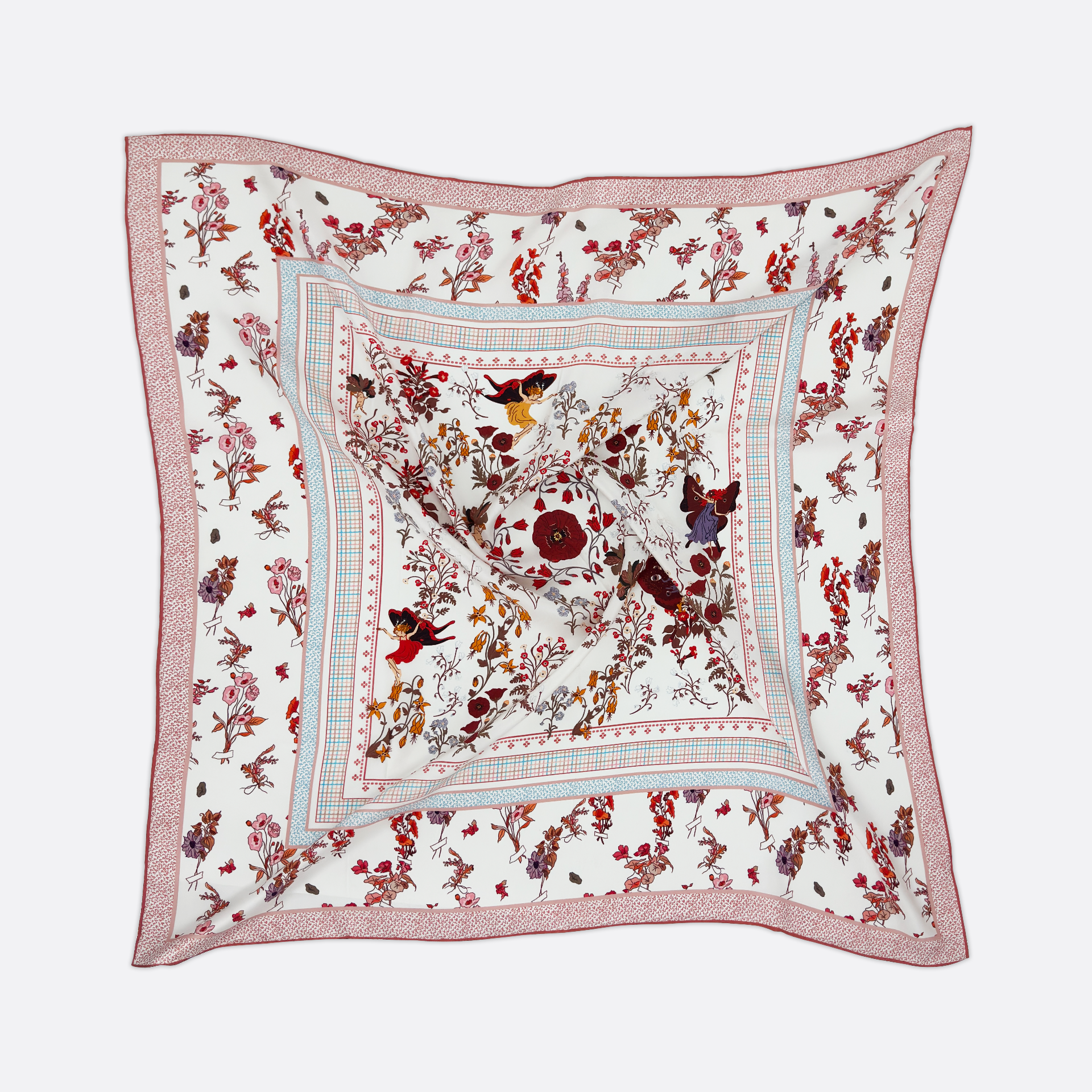 Celebrate the essence of spring with this exquisite silk scarf, adorned with a delicate symphony of blooming florals and fluttering birds. Inspired by the season’s renewal, its intricate design evokes the romance of nature in full bloom. Framed with elegant borders, this timeless piece drapes effortlessly, bringing a breath of fresh elegance to any ensemble.