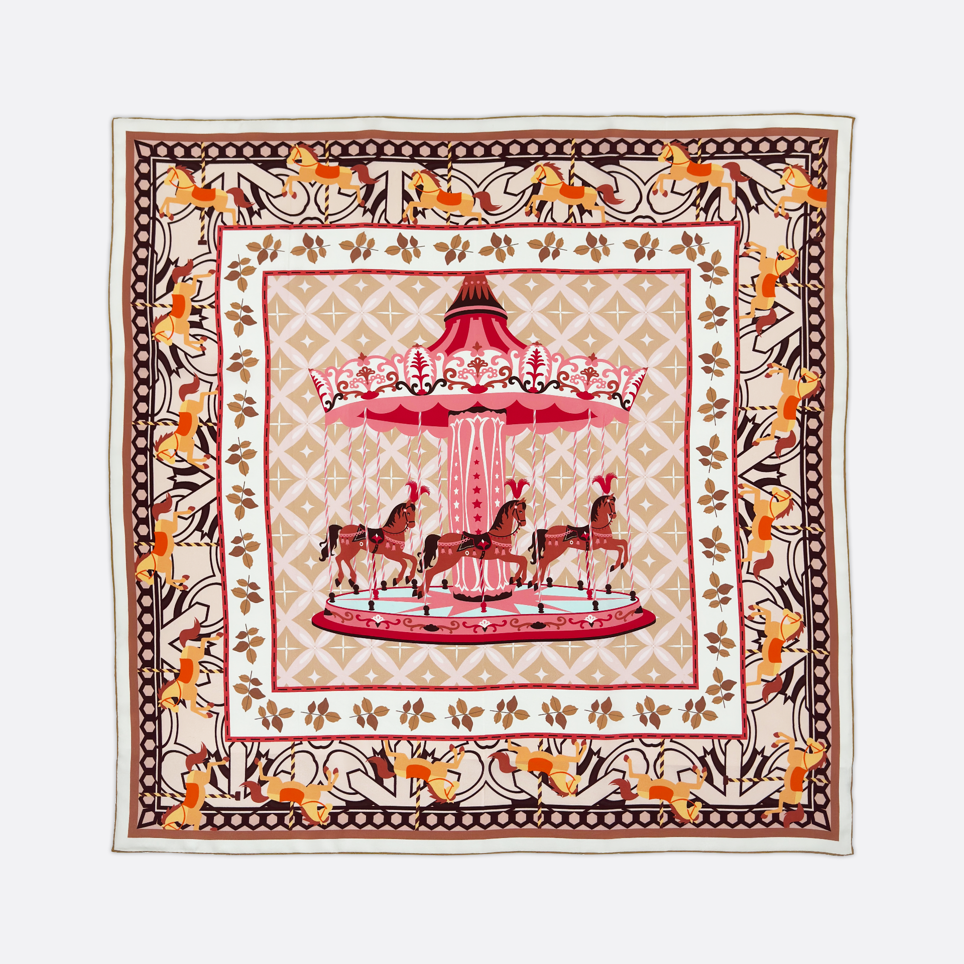 Step into a world of whimsy with this exquisite silk scarf, featuring an enchanting carousel motif framed by galloping horses and intricate detailing. Crafted from pure silk, it offers a smooth, luxurious drape that effortlessly elevates any look. A timeless statement of elegance and playfulness, perfect for those who appreciate artistry and charm.